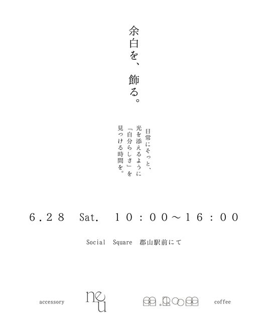 2025年6月28日(土)、ソーシャルスクエア郡山駅前店(運営:NPO法人ソーシャルデザインワークス/代表理事:北山 剛)にて、ごちゃまぜイベント「余白を、飾る。」を開催します。今回は、アクセサリー×コーヒーのコラボイベントです。