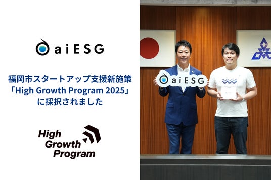 株式会社aiESG (アイエスジー、本社:福岡市博多区、代表取締役:馬奈木 俊介/以下、aiESG)は、製品およびサービスレベルのサプライチェーンESG分析評価コンサルティング・クラウドサービスを提供するアカデミア発のAIスタートアップ企業です。この度、福岡市の官民協働型スタートアップ支援施設「Fukuoka Growth Next(フクオカ グロース ネクスト)」(所在地:福岡市中央区大名、事務局長:池田貴信)が展開する、選抜型スタートアップ集中支援プログラム「High Growth Program 2025」に採択されたことをお知らせいたします。