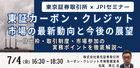 JPI(日本計画研究所)は、株式会社東京証券取引所 カーボン・クレジット市場整備室長 松尾 琢己 氏を招聘し、東証カーボン・クレジット市場の最新動向と今後の展望について詳説いただくセミナーを開催します。