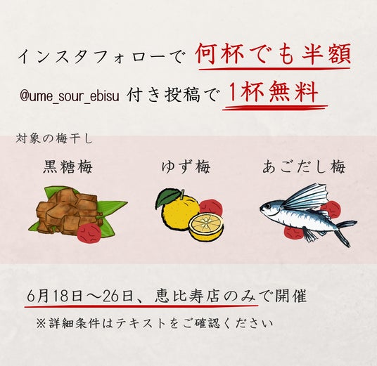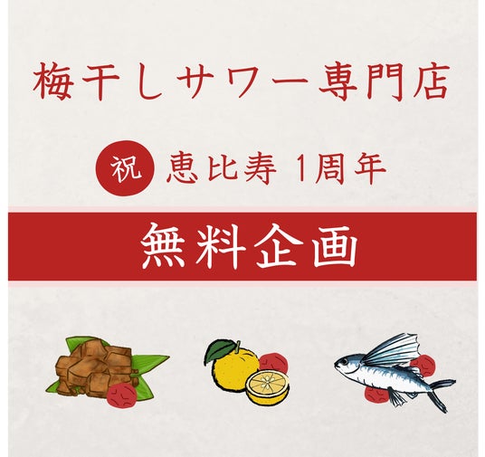 梅干しサワー専門店株式会社(本社:東京都渋谷区、代表取締役:大畑星瑛)は、恵比寿店をオープンして1周年を迎えました。日頃の感謝を込めて無料企画を期間限定で開催いたします。