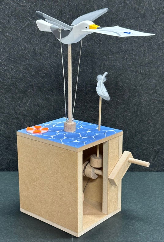 ゼンマイを巻くと、オルゴールの音色とともに鳥の翼、針金が動きます。飾りつけをアレンジして自分だけのオリジナルのからくり作品を作りましょう。
