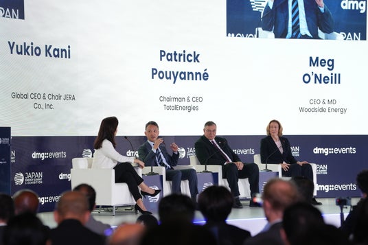 続いて行われた「Securing Tomorrow: A Vision for Sustainable Growth in the Energy Sector:未来の確保 ~エネルギー部門の持続可能な成長へのビジョン」と題したグローバルCEOパネルでは、Bloombergのアンカー シェリー・アン 氏をモデレーターに迎え、株式会社JERA 代表取締役会長 Global CEO 可児 行夫 氏、TotalEnergies 会長 兼 CEO パトリック・プイヤネ 氏、Woodside Energy CEO 兼 マネージングディレクター メグ・オニール 氏が登壇。