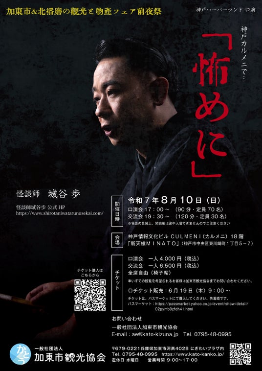 d122852-9-bbbba84d006cc548578e64eb65516836.pdf加東市&北播磨の観光と物産フェア前夜祭イベントとして、怪談師 城谷 歩 氏をお迎えして怪談イベント『怖めに』を神戸情報文化ビル CULMENI(カルメニ)18階「新天樓MINATO」(神戸市中央区東川崎町1丁目5-7)にて口演します。