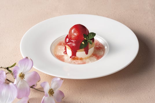 またデザートは二子玉川のシンボルツリーである「ハナミズキ」をテーマとした 「アーモンドのムースと福島県産桃のコンポート」をご用意しました。ピンクと白色の二色のジュレを円形にあしらい、「ハナミズキ」を思わせる淡い色合いを表現しました。これから旬を迎える桃を贅沢に使用し、色鮮やかなフランボワーズソースをまとったバニラアイスが調和した、甘みと酸味のバランスが絶妙なデザートです。