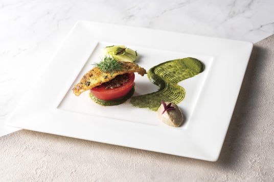 二子玉川という立地にちなみ、多摩川に生息するアユをモチーフとした温前菜「アユの香草パン粉焼き フルーツトマトのロースト アユのリエット添え」をディナーコースでご用意。穏やかな多摩川をイメージしたバジルのソースと、多摩川を泳ぐアユの姿をお皿のうえで表現。外はカリッと香ばしくパン粉をつけて焼き上げたアユは、味わいもまた格別です。