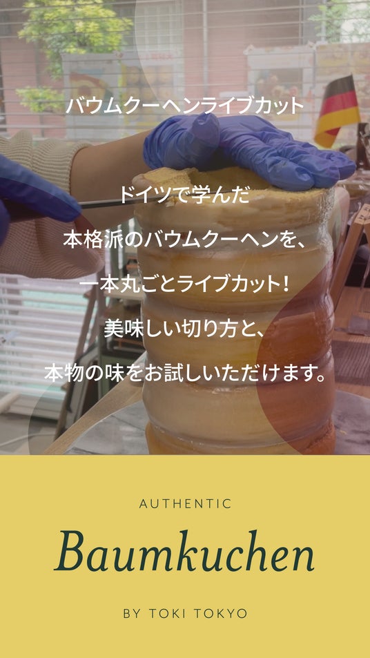 ドイツで学んだ本格派のバウムクーヘンを、一本丸ごとライブカット!美味しい切り方と、本物の味をお試しいただけます。