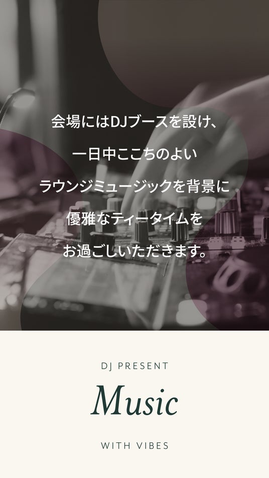 会場にはDJブースを設け、心地よいラウンジミュージックが流れる中、優雅でリズミックなラウンジティータイムをお過ごしいただけます。