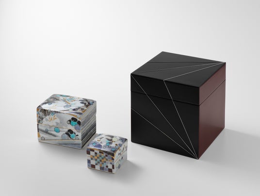 (左から)【佐藤 亮】陶筥「風花」8.2×10.7×高さ8.7cm、「色吹雪」6.3×6.3×高さ5.4cm、【荒川文彦】四方箱「光芒」15.5×15.5×高さ15.5cm