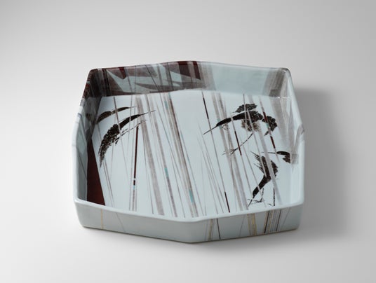 工芸の盛んな石川県という同じ風土から生まれた二人の作品は、素材は異なるものの、追い求める表現が互いに引き寄せられるように近いものがあります。今展では、造形やシャープな線引き、色合いなど共通の表現の中に、色絵磁器と漆の間(あわい)を楽しみながら制作に取り組んだ軌跡が覗えます。