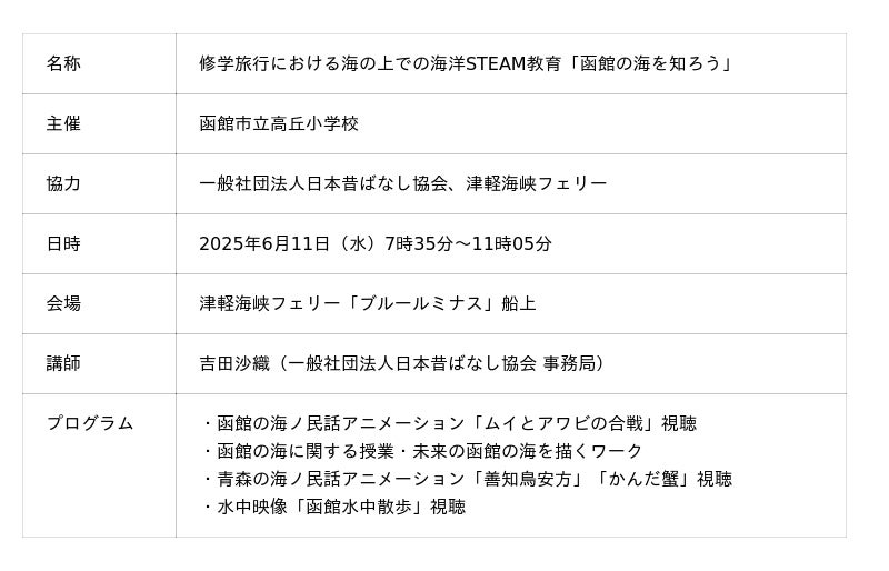 一般社団法人日本昔ばなし協会と日本財団が取り組む「海ノ民話のまちプロジェクト」は、2025年6月11日(水)、函館市立高丘小学校の「修学旅行における海の上での海洋STEAM教育」に協力し、同校の6年生54名を対象にした出張授業を実施しました。