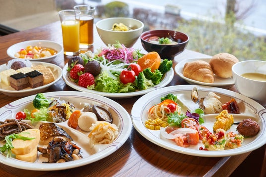 昼食は、阿蘇ファームランド内の「大阿蘇レストラン」にて、大自然の恵みを美味しく味わう阿蘇の健康バイキングをご用意しております。四季折々の美しい山々が一望できる広々とした空間でゆっくりと美味しいバイキングをお楽しみください。