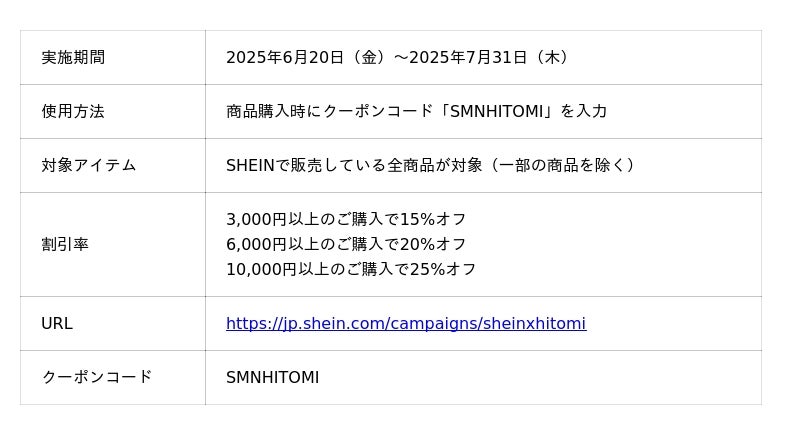 HITOMIさんのSHEIN 2025年度 夏シーズンモデル就任を記念して、SHEIN JAPAN初となるフォトカードキャンペーンやショールーム限定のアルバムキャンペーン、シーズンモデル就任記念クーポンでお得にSHEINの商品がご購入いただけるキャンペーンを実施いたします。さらに、SHEIN公式SNSで指定ハッシュタグを付けて投稿した方の中から抽選で、SHEINでご利用いただける30,000円分のギフトカードや、HITOMIさんのコーディネートをプレゼントいたします。◆最大25%オフ!スペシャルクーポン概要