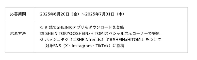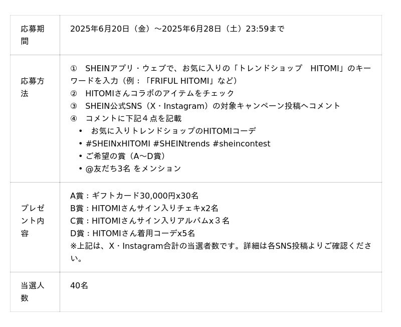 今回のコラボコレクションでは、HITOMIさんがSHEIN JAPAN人気のトレンドショップ「FRIFUL」「Dazy Weekend」をはじめとする5つのトレンドショップから、3Dフラワーや、ゴシックスタイルなど今季、日韓で注目されているトレンド要素を取り入れた最新20コーデを披露。さらに、HITOMIさんのSHEIN 2025年度 夏シーズンモデル就任を記念して、多数のキャンペーンを実施いたします。