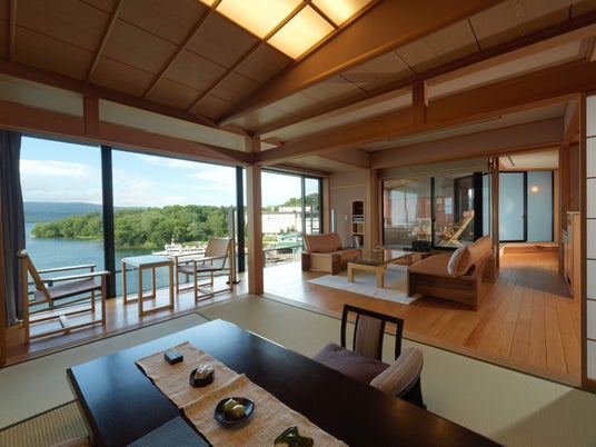鶴雅グループが展開するエグゼクティブクラス「座」シリーズの1つ「あかん鶴雅別荘 鄙の座」は、全室に露天風呂が付いたゆとりある設えのスイートルームをそなえた高級旅館。客室からは目の前に広がる阿寒湖と雄大な大自然の景色を楽しむことができます。お食事は北海道の旬の味覚と新鮮な素材にこだわる和食会席をご堪能いただけます。また、夕食時やバーラウンジ、客室冷蔵庫内など、滞在中の飲み物は一部特別なものを除き、全て無料でのご利用が可能です。