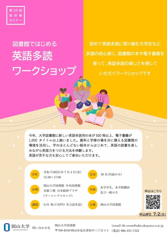 国立大学法人岡山大学(本部:岡山市北区、学長:那須保友)の岡山大学図書館中央図書館では、岡山大学第35回知好楽セミナー「図書館ではじめる英語多読ワークショップ」を、本学津島キャンパスで2025年7月4日(金)15:30~17:00に開催します。