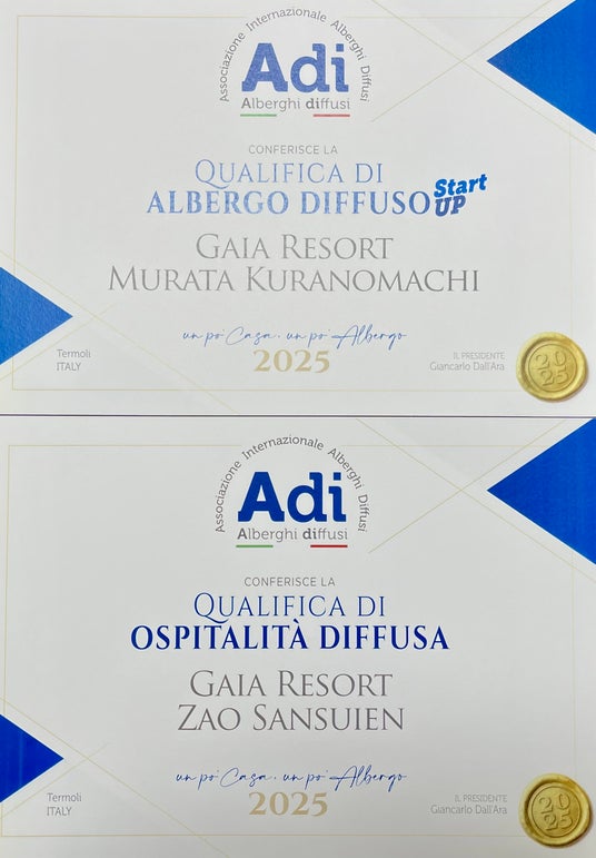 株式会社ガイア(本社:宮城県白石市、代表取締役社長 相澤国弘)は、当社が展開する観光まちづくり事業「ガイアリゾート蔵王山水苑」が、世界で初めて、かつ世界最大規模の「オスピタリタ・ディフーザ(Ospitalita Diffusa)」の認証を取得しました。