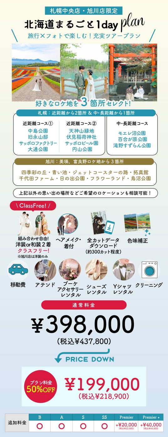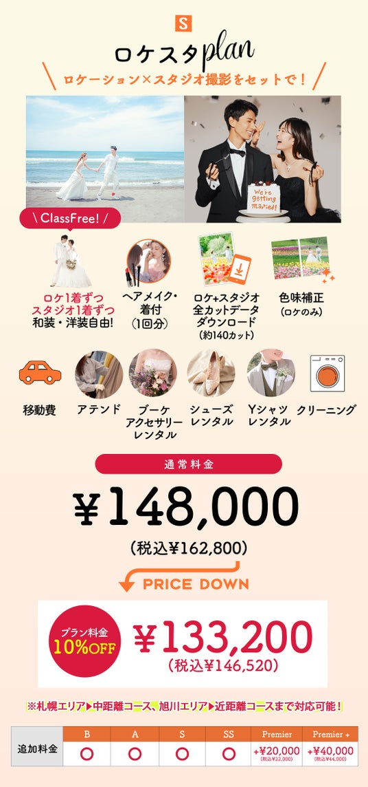 距離ごとに料金が異なる送迎代付きのロケーション、本格和室やチャペルを完備しているスタジオとの併用ができるロケスタプラン、北海道の名所3ヶ所を回れる北海道満喫プランなど、お客様の目的やご希望に合わせてお選びいただけます。