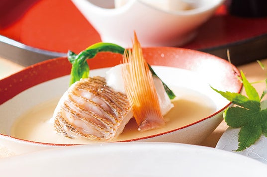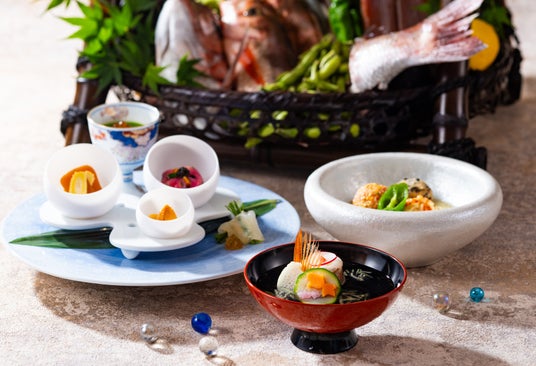 小鉢として「胡麻豆富」「薫鮭と蓴菜の涼風じゅれ 天、いくら」「江戸芯取菜(※1)胡麻和え」の3品、揚げ物としては、サクサクとした食感と素材の旨味を楽しめる「海老の葦火(あしび)揚げ(※2)、揚げ野菜」を用意。また、ひんやりとした食感と清涼な味わいの冷やし鉢「蝦夷鮑と夏やさいの豆乳蒸し ~生姜餡~」を提供する他、焼き物は「柳の舞柚庵焼き(※3) 付け合わせ」「鶏照り焼き 添え野菜」の2種からお選びいただけます。
