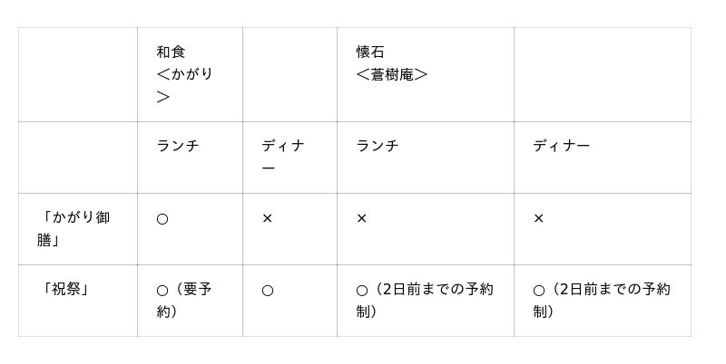 ・提供場所と時間帯:「かがり御膳」は和食<かがり>のランチタイムのみ提供。 「祝祭」は和食<かがり>・懐石<蒼樹庵>のランチ&ディナータイムで提供。