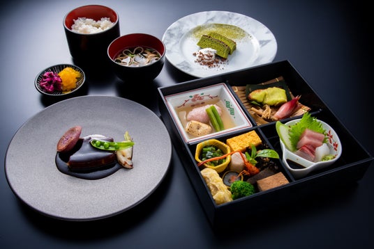 [提供内容:和前菜三寸盛 / 洋前菜 / スープ料理 / メイン料理(肉料理・魚料理から選択 / デザート / 食後のお飲み物 ※料理の途中でパンが付きます]