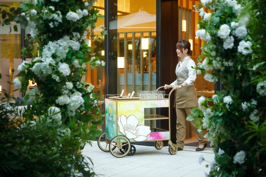 テラスには、ブランドの象徴である白いジャパニーズ・アネモネ(秋明菊)をモチーフにしたアーチがしつらえられ、訪れる人を優美な世界へと誘います。また、専用シャンパーニュワゴンがテーブルを巡り、グラスを満たしながら、その場で一杯をお届けする演出も。花咲くような空間の中、五感を満たすひとときをお過ごしいただけます。街の喧騒から離れ、花と泡が彩るひとときを心ゆくまで──午後の余白に広がる非日常のテラス体験を、ぜひこの夏お楽しみください。