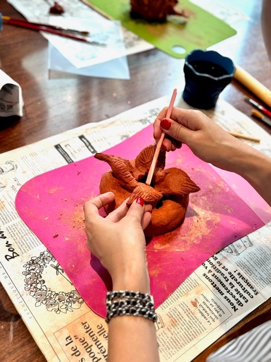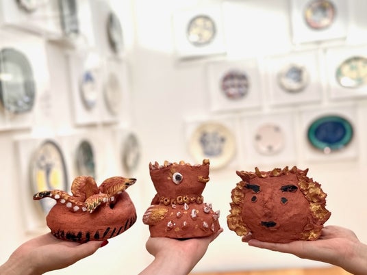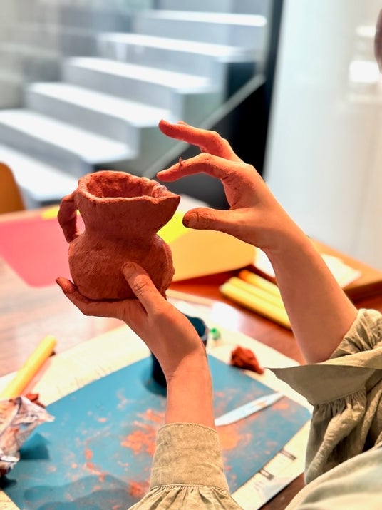 本プログラムは、教育普及担当学芸員とともに展覧会を巡るところからスタートします。学芸員と一緒に巡ることで、ピカソ作品そのものをしっかりと見て、興味深い点を発見します。その後、ピカソが器に生命を吹き込んだように、参加者自身が粘土を用いて“見立て”の視点から制作に挑戦します。