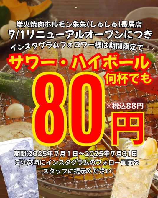 トラオム株式会社(本社:大阪市浪速区)が運営する『京もつ鍋 ホルモン焼肉 朱々(しゅしゅ) 長居店』は、2025年7月1日(火)に『炭火焼肉ホルモン 朱朱(しゅしゅ) 長居本店』としてリニューアルオープンいたします。