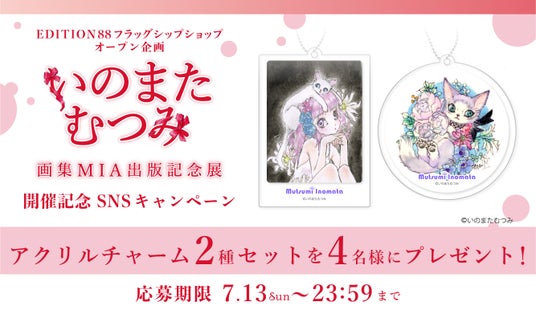 X(旧Twitter)と Instagramで展示会開催を記念して、いのまたむつみオリジナル アクリルチャーム2種セットを合計4名様にプレゼント!