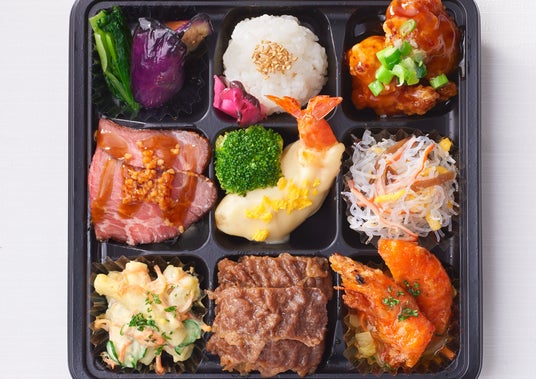 柿安ダイニングの人気商品を勢ぞろいさせた夢のようなお弁当。「黒毛和牛 牛めし」や「ローストビーフ」、「大海老マヨ」、「ガーリックシュリンプ」など、色々なものを少しずつ食べたい方におすすめです。