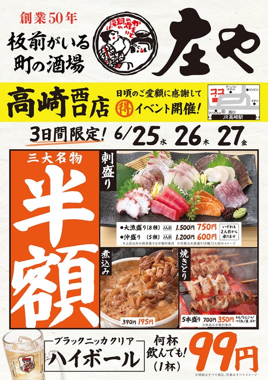 「はい!よろこんで」でお馴染みの“板前がいる町の酒場”『庄や』高崎西口店(運営:株式会社大庄)は、2025年6月25日(水)より6月27日(金)までの3日間限定で、日頃のご愛顧に感謝を込め「刺身盛り合わせ」「煮込み」「焼き鳥」の三大名物を半額とする“半額感謝祭”を実施します。豊洲仲卸直送の鮮魚を使った刺身盛り合わせ「大漁盛り(8種盛)」は、通常1人前1,500円を半額の750円、同「沖盛り(5種盛)」は通常1人前1,200円を600円にて。加えて、不動の人気「煮込み」は通常390円を半額の195円。さらに、創業から受け継がれる味わい「焼きとり五本盛り」は、通常700円のところ半額の350円での超特価で提供します。