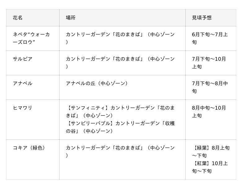 その他にも、夏らしいヒマワリやアナベル、コキア(緑葉)などを楽しむことができます。