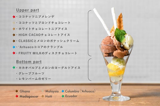 6カ国のカカオを使用した全8種のチョコレートパーツを、フルーツとの相性を考えて繊細に調整しました。産地ごとに異なるカカオの個性を活かした、多彩な味わいと満足感、そして夏らしいフレッシュさが詰まった特別なパフェです。