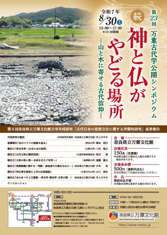 奈良県立万葉文化館では、第8回奈良県立万葉文化館主宰共同研究(令和5・6年度実施)の研究成果報告の一環として、下記のとおり公開シンポジウムを開催します。
