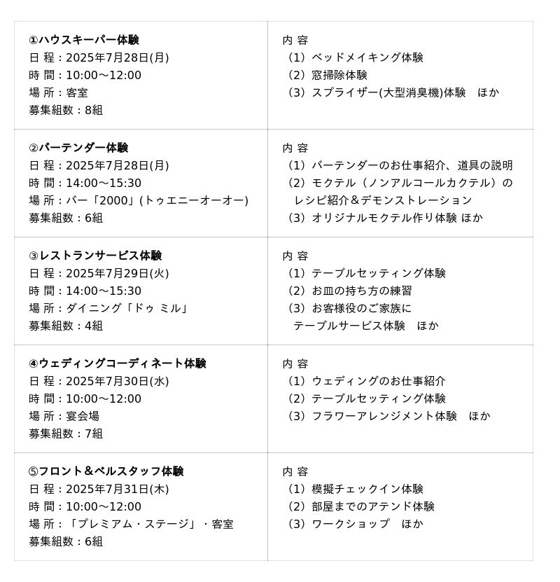 「夏休みにもっと楽しく学ぼう!ホテルのお仕事体験」開催概要