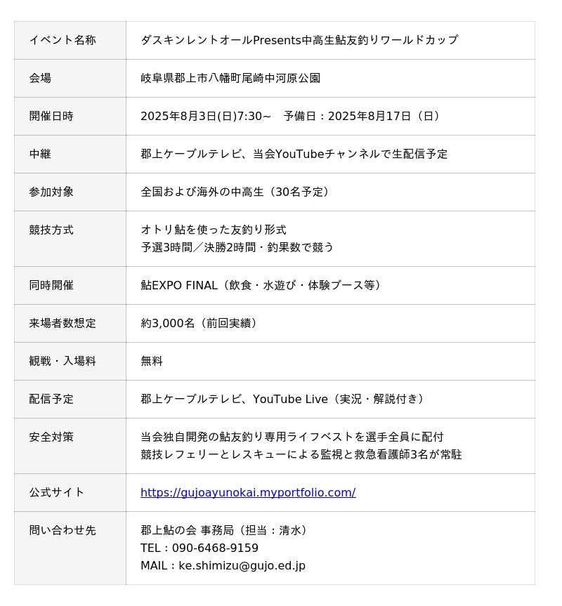 岐阜県郡上市を拠点に活動する「郡上鮎の会」は、2015年に郡上市立八幡中学校の生徒たちの「若者の鮎友釣り人口を増やしたい」という熱い想いから始まった「学生発の日本最大級釣りイベント」である『中高生鮎友釣りワールドカップ(冠スポンサー:ダスキンレントオール)』を2025年8月3日(日)に岐阜県郡上市八幡町尾崎中河原公園で開催します。本イベントは、以来10年間、地元と全国の中高生、そして地域企業とともに歩みを進め、今や釣りイベントとしては来場者数3,000人超の日本最大規模に発展しました。今回の開催で、ダスキンレントオールが冠協賛し、地域と全国の学生、企業、観光客をつなぐ「地域共創型イベント」として、これまでの集大成を披露します。この大会は、日本の伝統漁法『鮎の友釣り』の次世代への継承と、若者たちが地域や社会と繋がり、自らの夢を実現する教育機会を提供するという大きな目的を担っています。