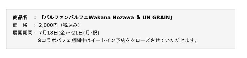 UN GRAINの愛され商品であるお手持ちパフェ。今回特別に、在籍中はスタッフで独立したパティシエたちと、当ブランドの中核を担うパティシエたちとで共同開発し、期間限定で販売します。7月は「TOUMIN」シェフパティシエであり、自身のブランド「Wakana Nozawa」でも活躍する野澤 倭歌菜氏とのコラボレーションが実現。9月には、食べられる写真展「総造」を友人のフォトグラファーと立ち上げ、京都を拠点に活動されている畑谷 実咲氏とのコラボを予定しています。それぞれの個性と感性が光る、4日間限定の贅沢な逸品をぜひこの機会にご堪能ください。■【Wakana Nozawa(野澤シェフ)× UN GRAIN】
