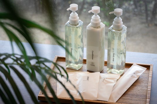 客室では、シンプルで洗練されたオリジナルパッケージのアメニティをご用意しています。白紙包材にCCGアライアンスのロゴマークのみをあしらい、余計な装飾を省いたミニマルなデザインが特徴です。シャンプー・コンディショナー・ボディソープは、「自然の循環を通じて、自然環境の調和を目指す」という理念のもとに開発されたブランド「IUGEN(イウゲン)」を採用しています。100%再生PET容器を使用し、サステナブルな環境に配慮。さらに、日本各地から厳選された素材を使い、10種類の天然由来保湿成分を配合することで、髪や肌にやさしく、心地よい使用感をご体感いただけます。