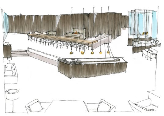 大きなカウンターを備えたパーティースペース「KOYOMI STUDIO」は、スタイリッシュなコンクリートの空間にあり、テーブルやハイチェアーが設置された、多目的にご利用いただけるスペースです。食後のカクテルを楽しんだり、気の合う仲間の集まりに最適な環境を提供します。