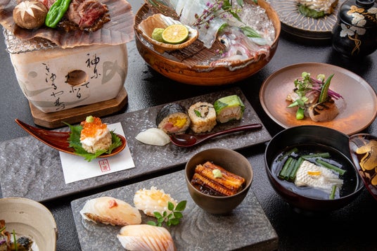 ダイニングでは、旬の素材を活かした鮨会席をご提供します。唐津湾や玄界灘で水揚げされた新鮮な魚介をはじめ、九州各地から厳選した食材を用い、四季の移ろいを感じられる特別なコースをご用意いたします。鮨は、先付や椀物、一品料理など日本料理の流れの中に織り交ぜるスタイルでご提供。料理の間を彩るように供されることで、味わいに緩急と奥行きが生まれ、より豊かな食体験へと導きます。職人が丹精込めて仕上げる鮨と、繊細な日本料理が調和し、一皿ごとに五感が満たされるひとときをご堪能いただけます。