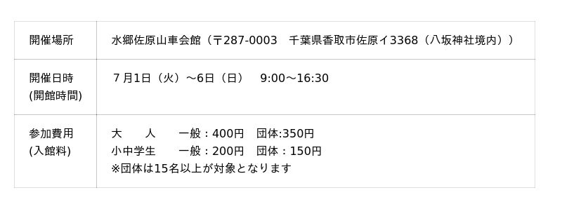 展示されている山車・彫刻・大人形は、夏祭りと秋祭りの前後に入れ替えを行っておりますので、毎年違った展示内容が楽しめます。たくさんの方のお越しをお待ちしております。