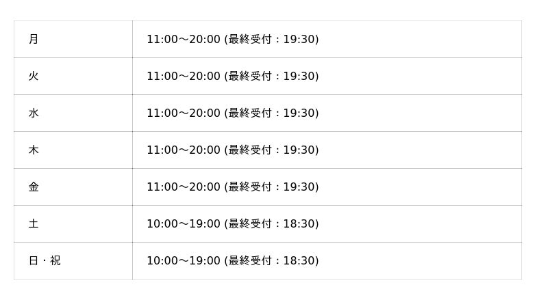メンズ眉毛サロン 眉ラボ 大宮店 の営業時間は以下の通りです。