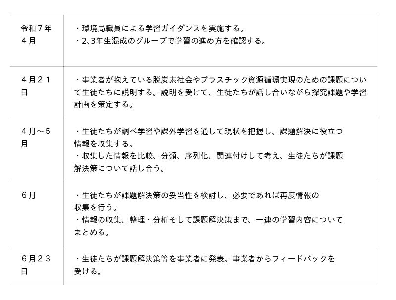 今回、市立橘高等学校の生徒の2、3年生が、事業者8社が抱えている脱炭素社会やプラスチック資源循環実現のための課題に対し、現状を調査・探究し、更なる取組の推進につながる解決策を各事業者へ6月23日(月)に提案しました。
