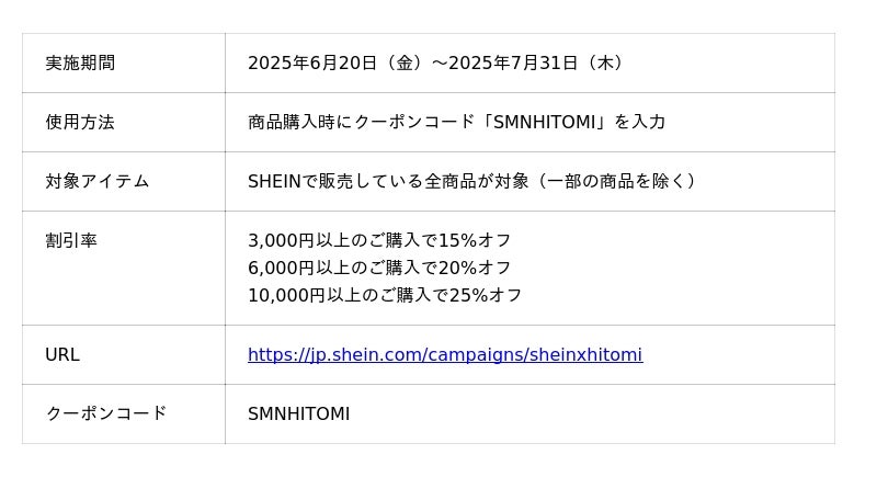 HITOMIさんのSHEIN 2025年度 夏シーズンモデル就任を記念して、SHEIN JAPAN初となるフォトカードキャンペーンやショールーム限定のアルバムキャンペーン、シーズンモデル就任記念クーポンでお得にSHEINの商品がご購入いただけるキャンペーンを実施いたします。さらに、SHEIN公式SNSで指定ハッシュタグを付けて投稿した方の中から抽選で、SHEINでご利用いただける30,000円分のギフトカードや、HITOMIさんの着用コーディネートをプレゼントいたします。◆最大25%オフ!スペシャルクーポン概要