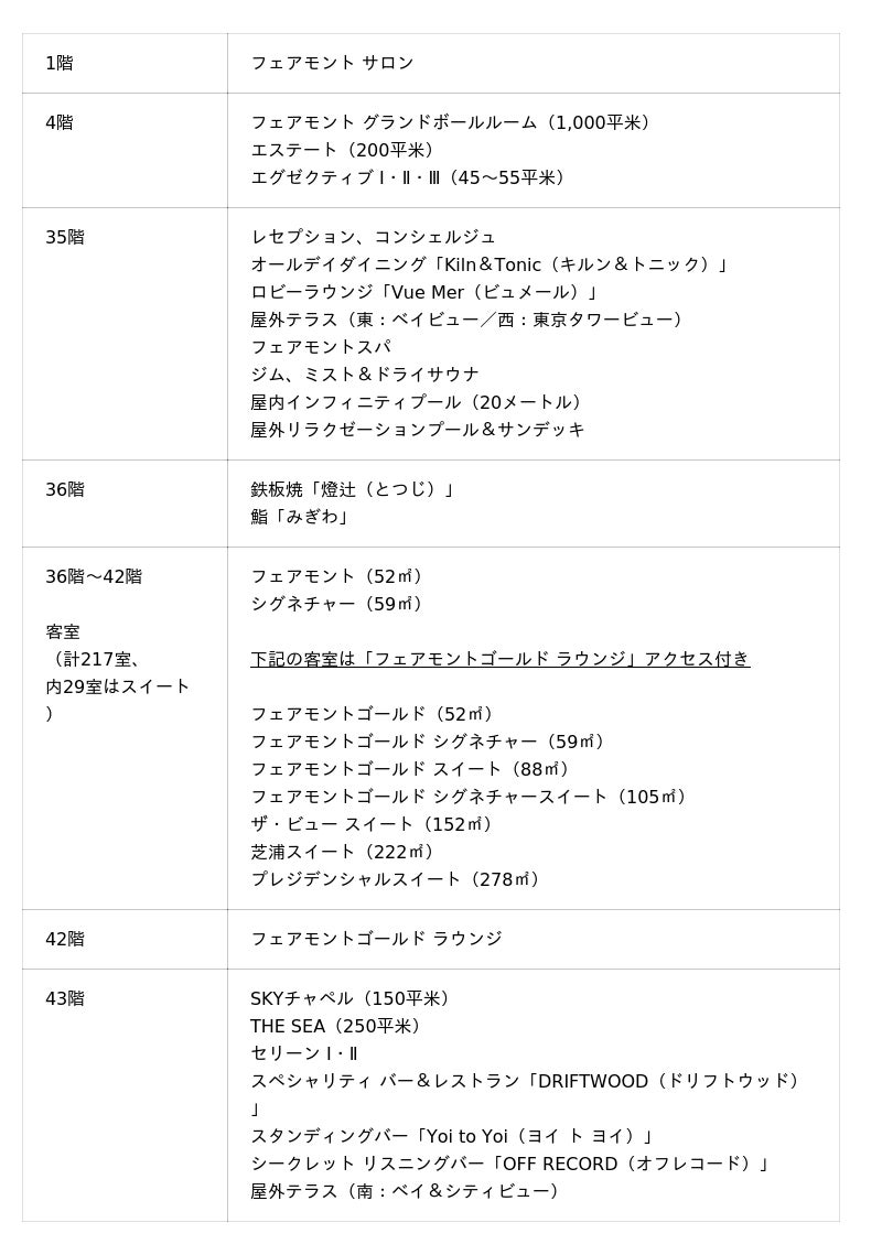 東京湾のほとりに佇む「フェアモント東京」は、西には東京タワー、東には東京湾を一望する絶好のロケーションに位置し、都心の躍動と水辺の静けさが響き合う特別なひと時をご提供いたします。館内には、29のスイートを含む全 217のゆったりとした客室、エグゼクティブラウンジ『フェアモントゴールド ラウンジ』、5つのレストラン&2つのバー、屋外テラス、スカイチャペル、宴会場、スパ、屋内インフィニティプール、屋外リラクゼーションプール、ジム、サウナなど、心身を満たす充実の施設を完備。「フェアモント東京」は、芝浦の地とフェアモントがそれぞれに紡いできた歴史が時を経て交わり生まれた場所です。その必然の重なりに敬意を表し、すべての人に開かれたラグジュアリーホテルとして、訪れるすべてのお客様に心に残る体験をお届けします。
