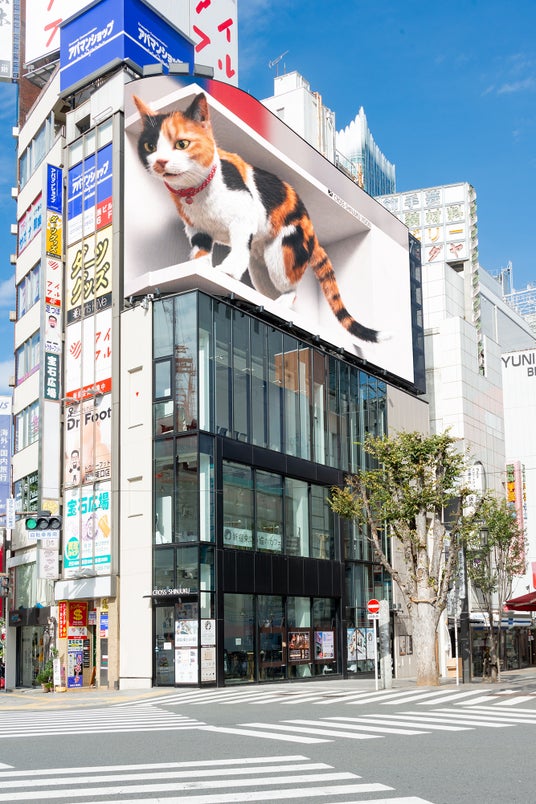 新宿駅東口の『クロス新宿ビジョン』(所在地:東京都新宿区新宿3-23-18)は、3D巨大猫の映像が世界的に拡散し、一躍新宿の新名所・ランドマークとなりました。