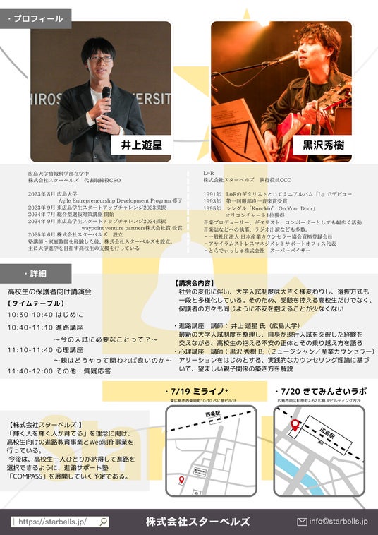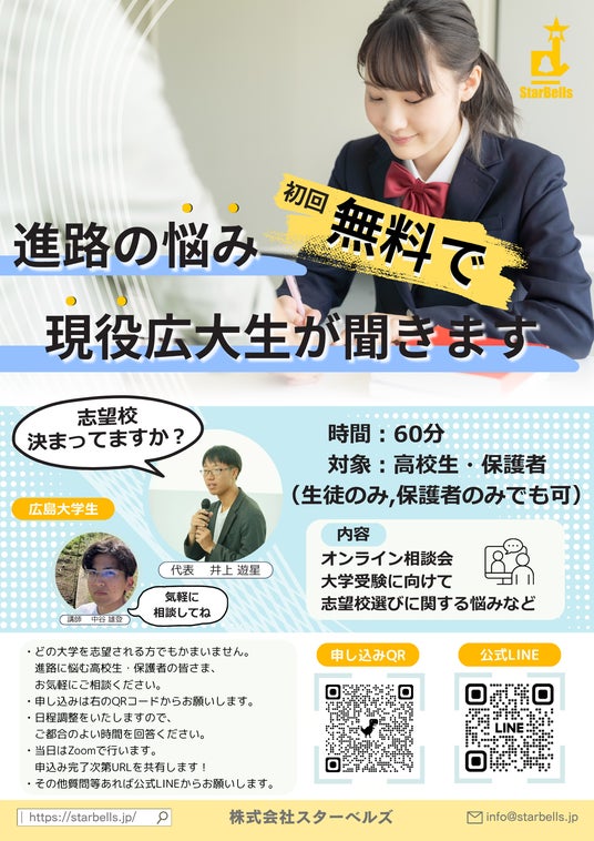株式会社スターベルズ(広島県東広島市、代表取締役:井上遊星)が運営する、オンライン進路サポート塾『COMPASS』では 専属の現役大学生講師が高校生を個別にサポートし、大学入試という大きな意思決定に後悔がないように徹底してサポートします!
