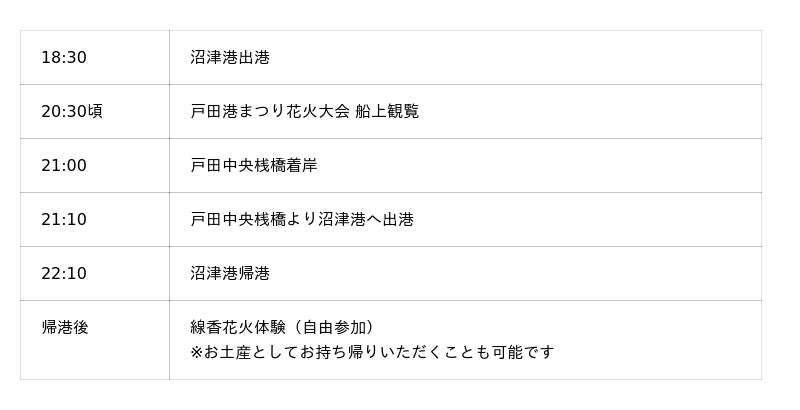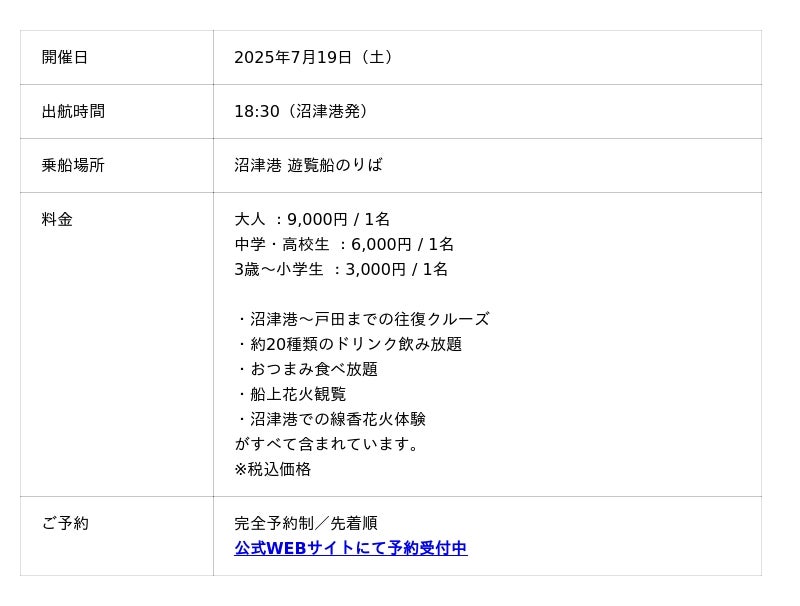 本クルーズは、富士山と駿河湾の絶景が広がる沼津港を出発し、夕暮れのサンセットクルーズとともに船上での飲み放題・食べ放題を楽しみながら西伊豆・戸田港で開催される「戸田港まつり花火大会」を混雑知らずの“海上の特等席”からゆったりと観覧できる一夜限りの限定イベントです。