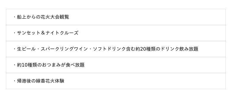 船上で味わう非日常の開放感と、海上から眺める花火の迫力。帰港後には線香花火体験もご用意し、心ゆくまでお楽しみいただけます。
