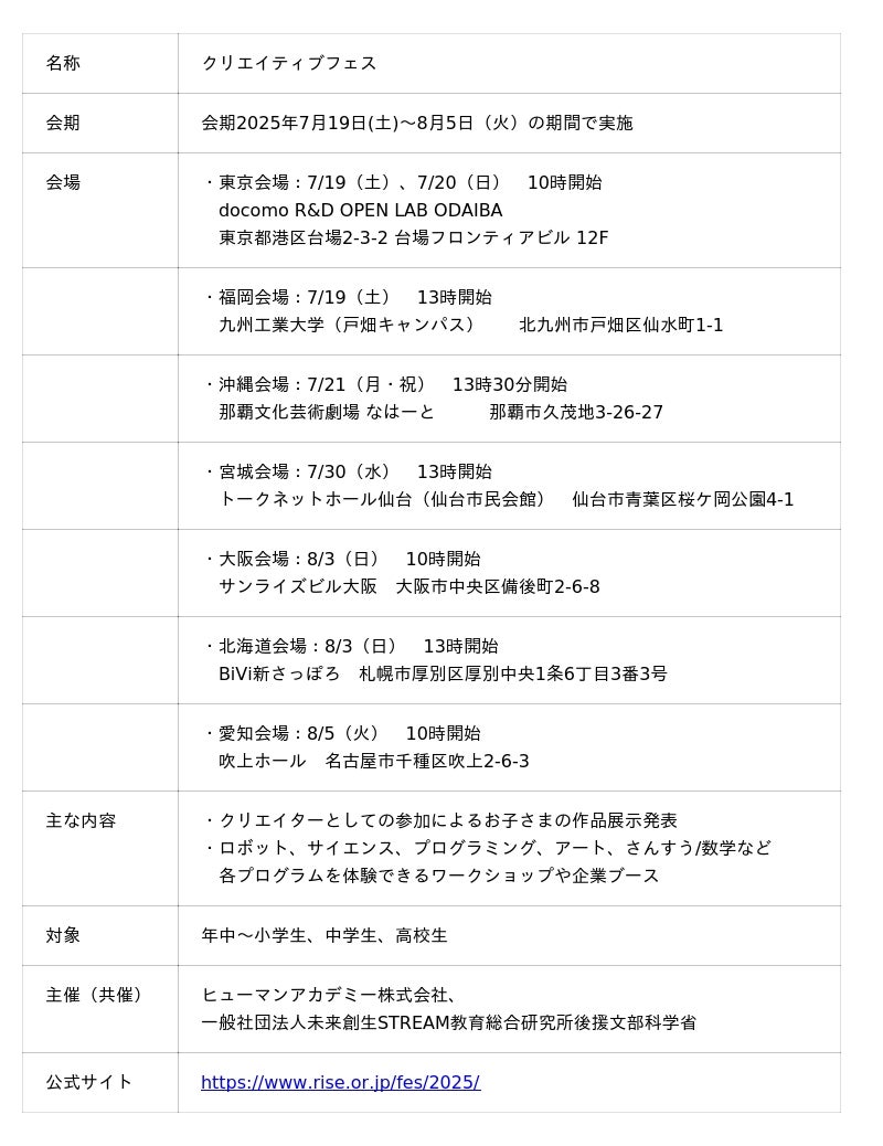 教育事業を展開するヒューマンアカデミー株式会社(本社:東京都新宿区、代表取締役:今掘健治、以下「当社」)の児童教育事業「ヒューマンアカデミージュニア」は、一般社団法人未来創生STREAM教育総合研究所:Research Institute of STREAM Education for Creating the Future(略:RISE)」(所在地:東京都新宿区、代表:須藤冬暁、以下「当協会」)と共催で、未来を生き抜く子どもたちの「創造力」と「探求心」を育む体験型教育イベント「クリエイティブフェス」を、2025年7月19日(土)から8月5日(火)まで、全国7都市(札幌・仙台・東京・愛知・大阪・北九州・那覇)にて開催いたします。