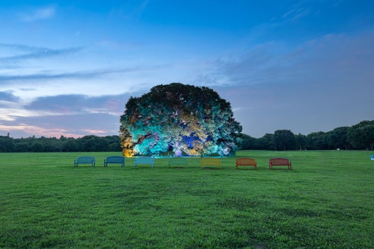 みんなの原っぱ・大ケヤキの試験点灯の様子(2025年6月29日撮影)
